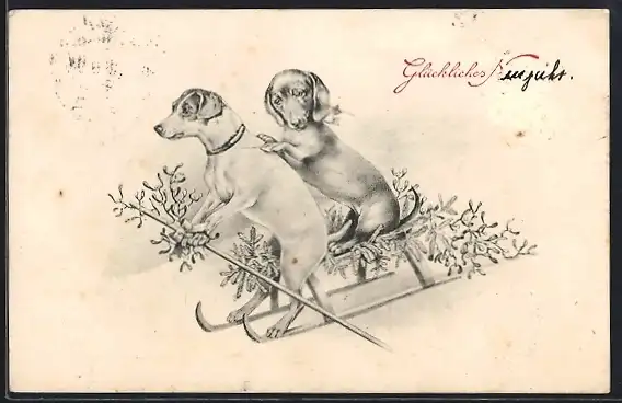 AK Dackel und Gefährte auf Fahrt im Rodelschlitten, Misteln, Neujahrsgruss