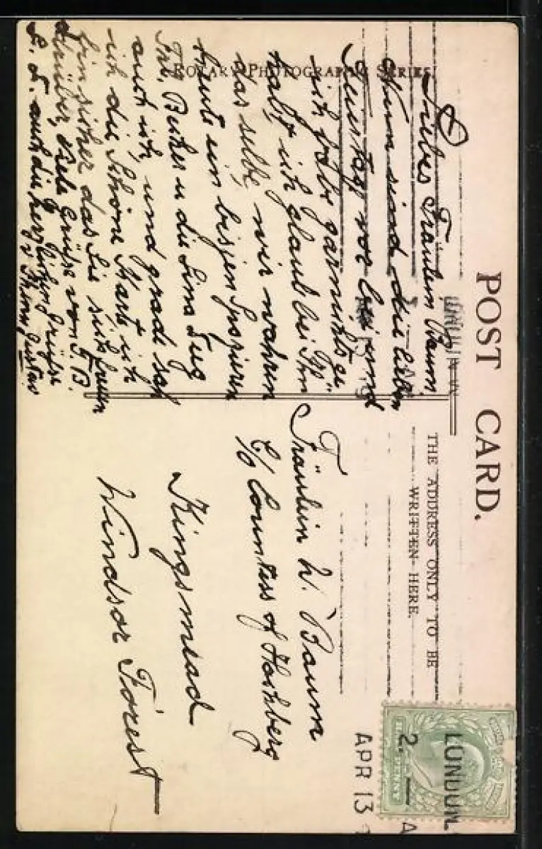 Personenbezogene Daten auf der Rückseite der Karte wurden durch blauen Textmarker unkenntlich gemacht. Die blauen Stellen sind auf die Vorderseite durchgeweicht und wirken sich negativ auf das Postkartenfoto aus