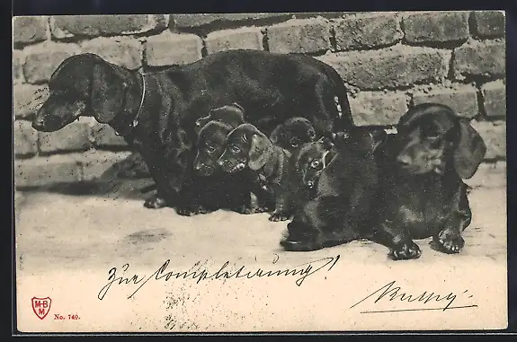 AK Dackelfamilie mit Wurf vor einer Ziegelwand