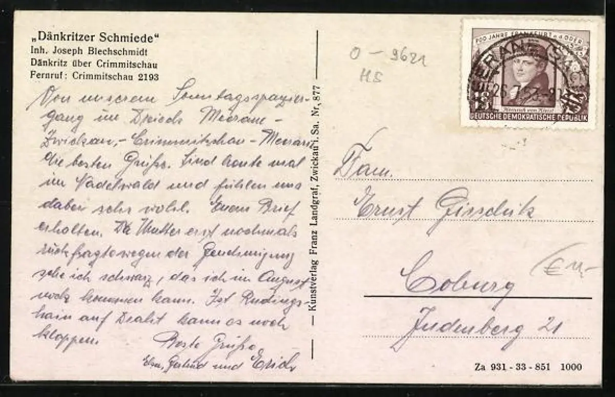 AK Dänkritz über Crimmitschau, Waldgasthaus Dänkritzer Schmiede