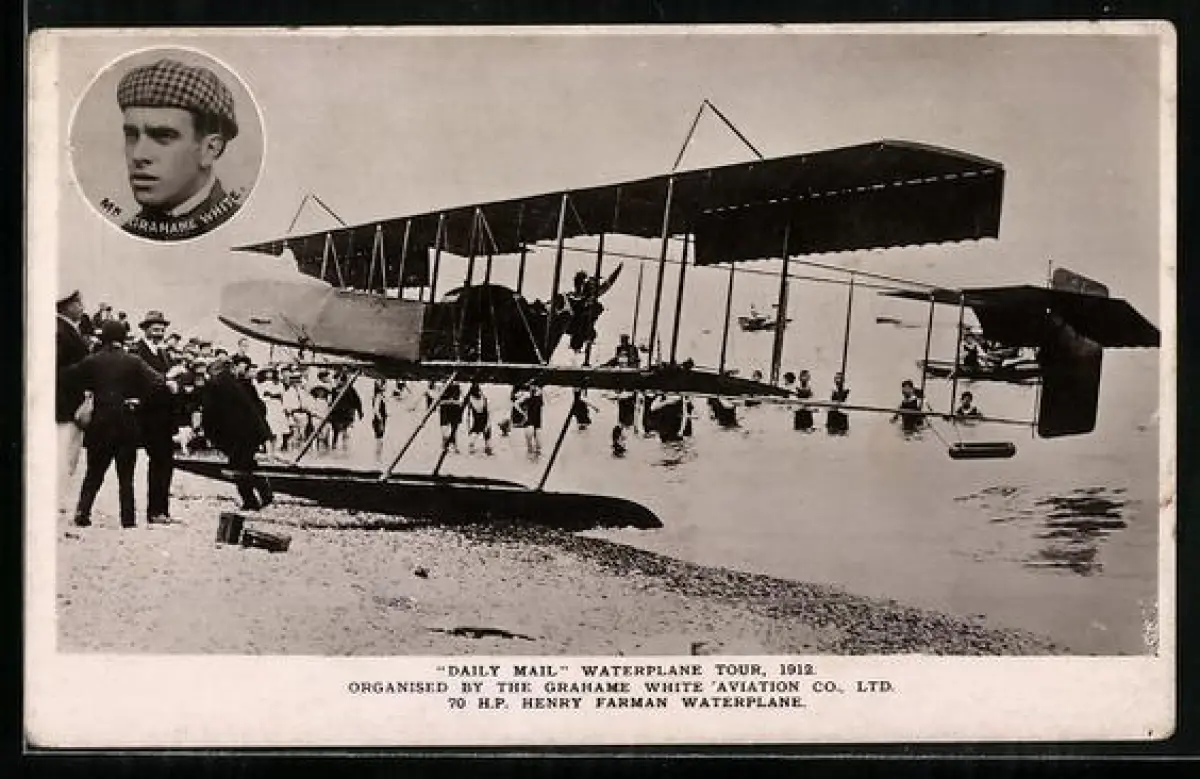 AK Daily Mail Waterplane Tour, 1912, H. P. Henry Farman Waterplane, Mr. Grahame White, Wasserflugzeug am Strand