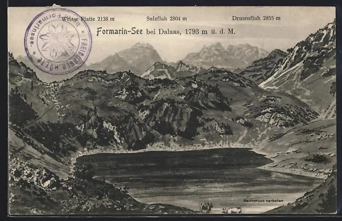 AK Dalaas, Blick auf den Formarin-See, Weisse Platte, Sulzfluh und Drusenfluh