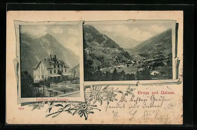 AK Dalaas, Gasthaus zum Paradies, Ortsansicht aus der Vogelschau