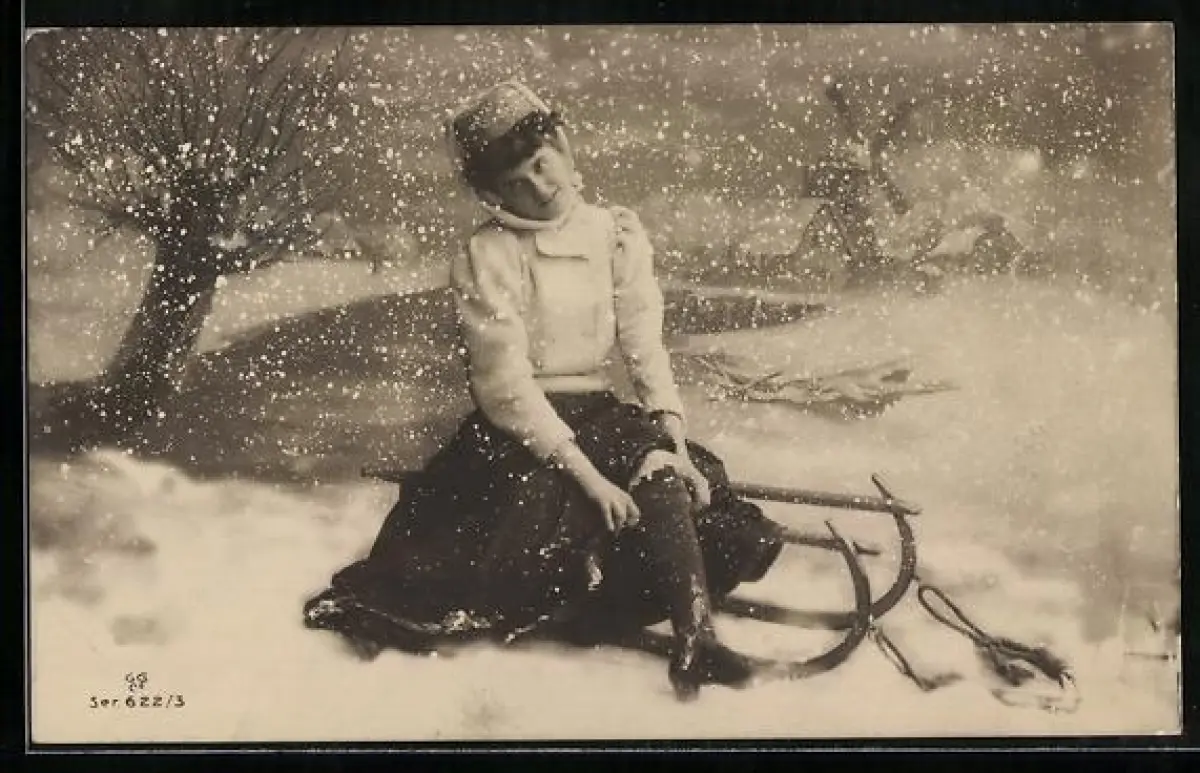 AK Dame richtet sich auf einem Schlitten sitzend den Strumpf