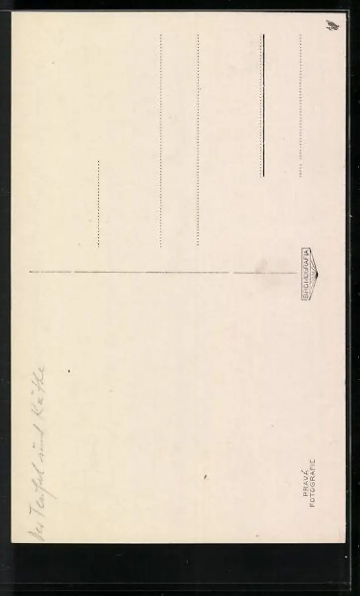 Personenbezogene Daten auf der Rückseite der Karte wurden durch blauen Textmarker unkenntlich gemacht. Die blauen Stellen sind auf die Vorderseite durchgeweicht und wirken sich negativ auf das Postkartenfoto aus