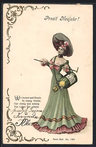 AK Dame trägt eine Sektflasche über der Schulter, Prosit Neujahr