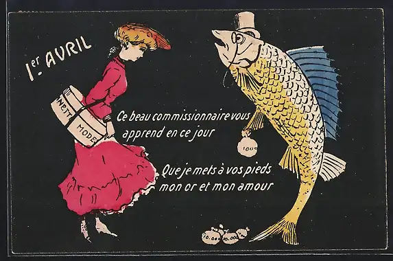 AK Dame trifft Fisch im Zylinder mit Monokel und Geldsäcken, 1. April