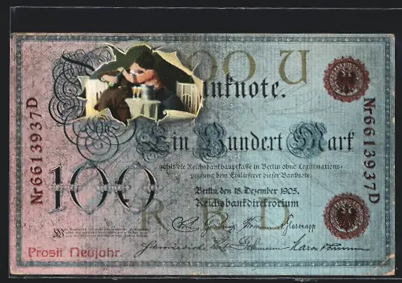 AK Dame und Herr küssen sich hinter Einhundert Mark Schein