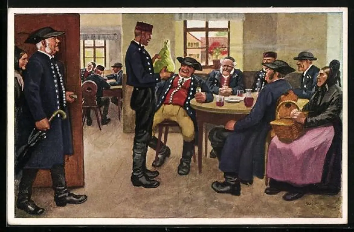 AK Damen u. Herren in schwäbischer Tracht sitzen im Wirtshaus