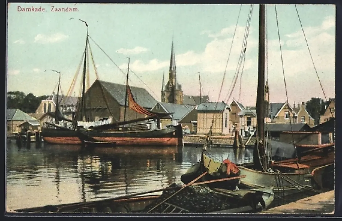 AK Damkade, Zaandam, Hafenpartie mit angelegten Segelbooten und Blick auf Kirche