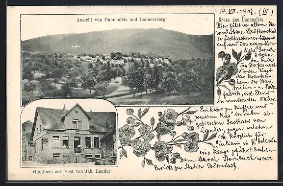 AK Dannenfels, Gasthaus zur Post J. Lander, Ortsansicht mit Donnersberg