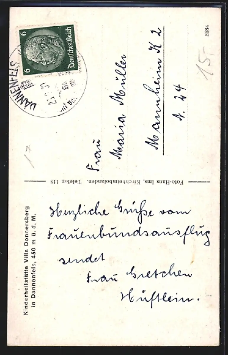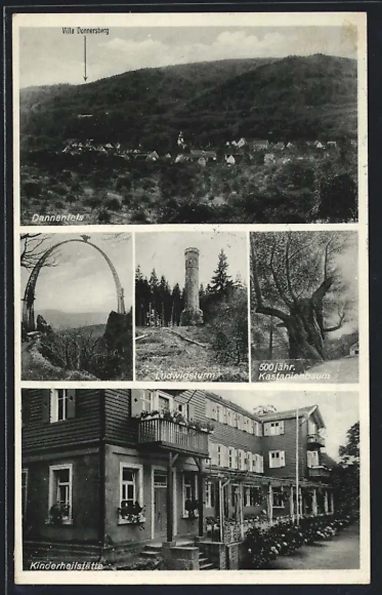 AK Dannenfels, Kinderheilstätte Villa Donnersberg, Moltkebogen, Ludwigsturm, 900 Jahre alte Kastanie