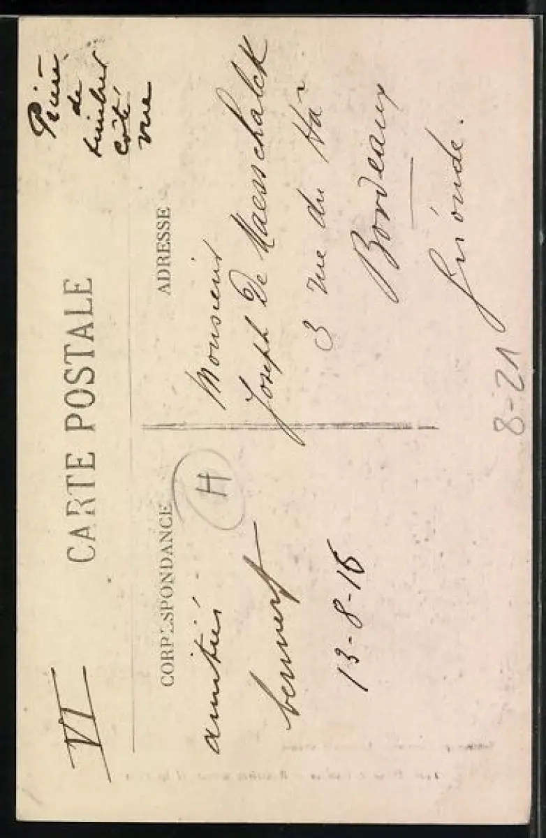 Personenbezogene Daten auf der Rückseite der Karte wurden durch blauen Textmarker unkenntlich gemacht. Die blauen Stellen sind auf die Vorderseite durchgeweicht und wirken sich negativ auf das Postkartenfoto aus