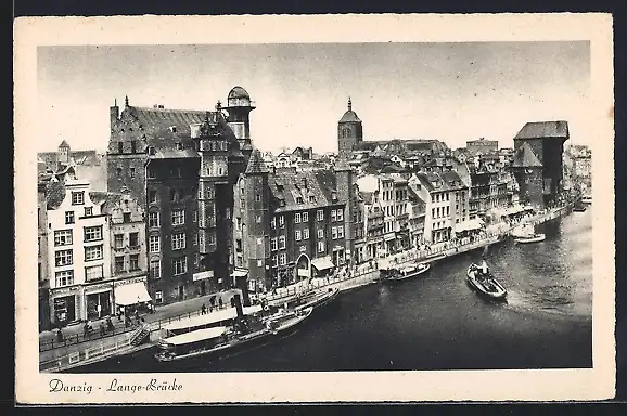 AK Danzig, Lange-Brücke mit Booten und Blick auf die Stadt