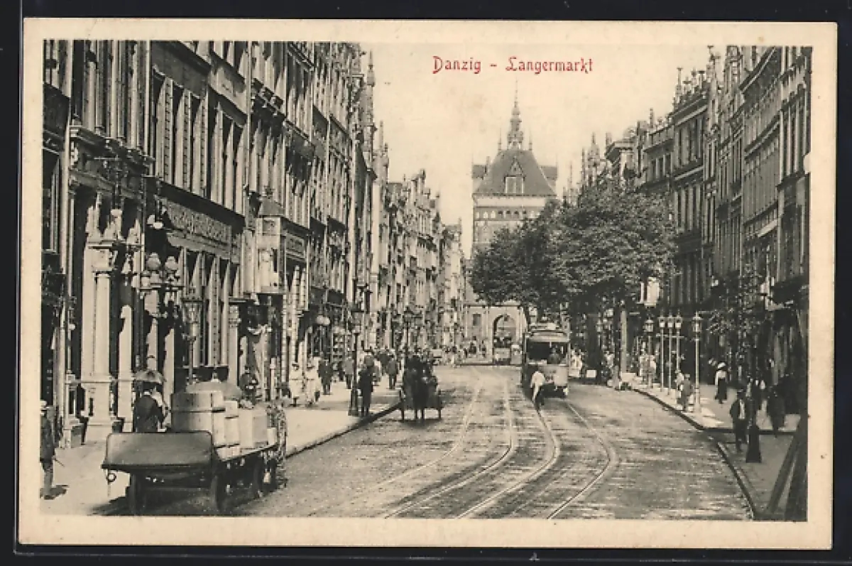 AK Danzig, Langermarkt mit Strassenbahn und Geschäften