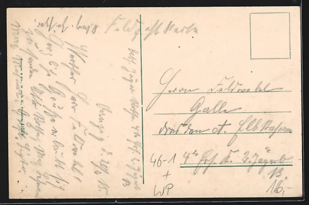 Personenbezogene Daten auf der Rückseite der Karte wurden durch blauen Textmarker unkenntlich gemacht. Die blauen Stellen sind auf die Vorderseite durchgeweicht und wirken sich negativ auf das Postkartenfoto aus