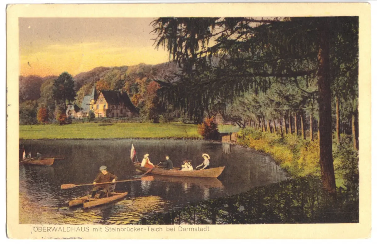 Ansichtskarte Darmstadt Oberwaldhaus mit Steinbrücker Teich, belebt Erhaltung I-II postalisch gelaufen, gestempelt: Darmstadt, 8.3.15 Verlag: Wilhelm Gerling, Darmstadt - 1603 Im Inland erfolgt die Zusendung versandkostenfrei Auslandsversand erfolgt über
