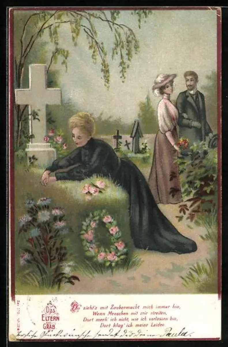 AK Das Elterngrab, Frau trauert an der Rasenbank