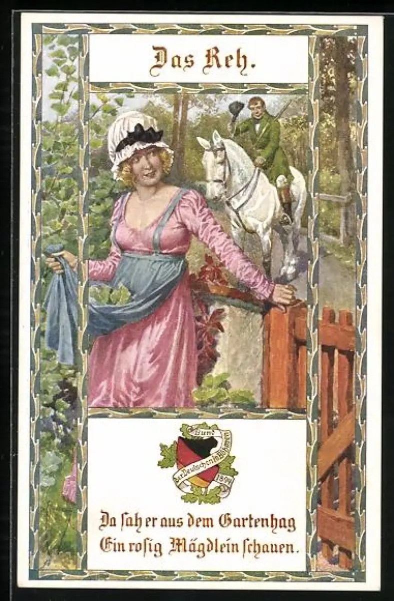 AK Das Reh, Reiter sieht im Garten eine junge Frau