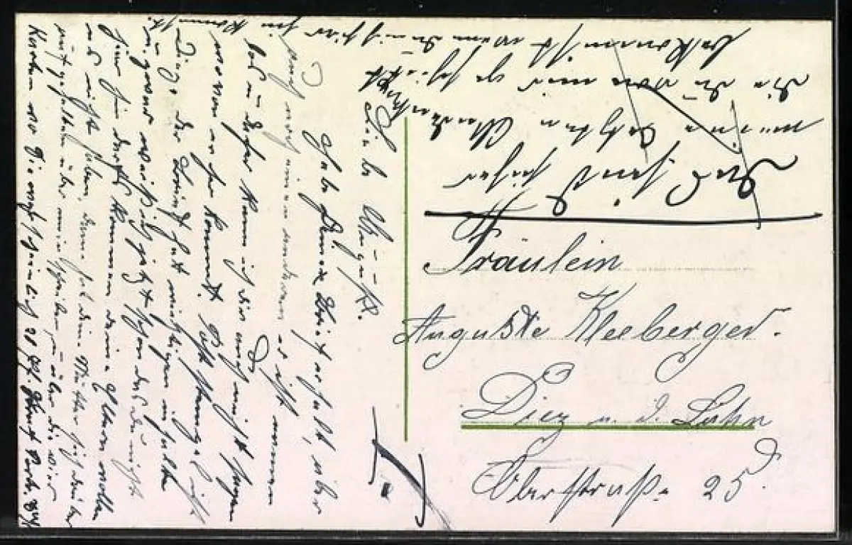 Personenbezogene Daten auf der Rückseite der Karte wurden durch blauen Textmarker unkenntlich gemacht. Die blauen Stellen sind auf die Vorderseite durchgeweicht und wirken sich negativ auf das Postkartenfoto aus