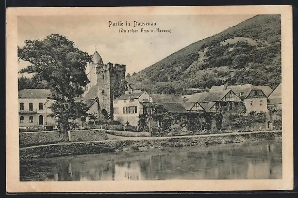 AK Dausenau, Ortspartie vom Wasser, mit Wehrturm u. Kirche
