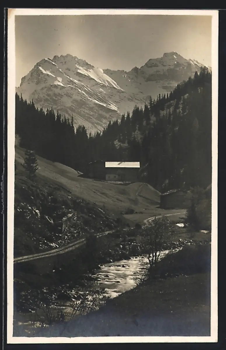 AK Davos, Sertigtal, Blick ins Tal mit Flusspartie und Haus