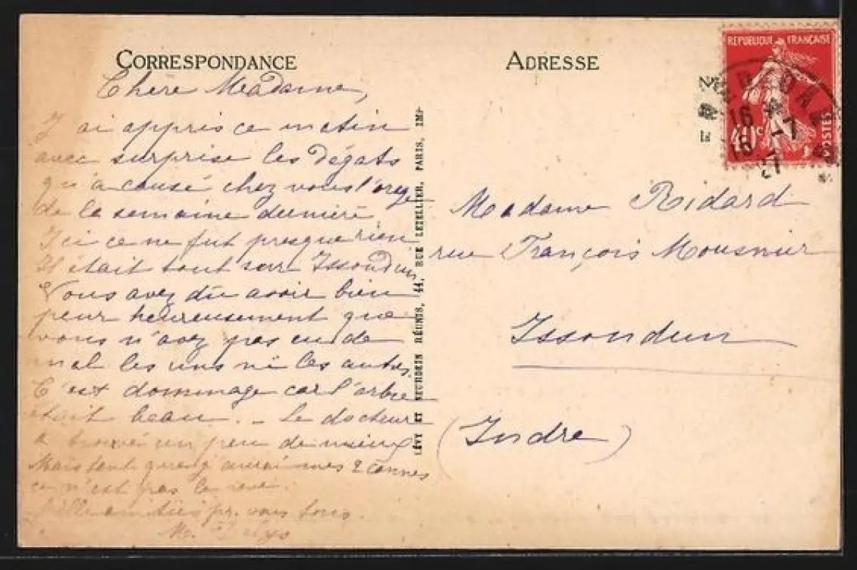 Personenbezogene Daten auf der Rückseite der Karte wurden durch blauen Textmarker unkenntlich gemacht. Die blauen Stellen sind auf die Vorderseite durchgeweicht und wirken sich negativ auf das Postkartenfoto aus