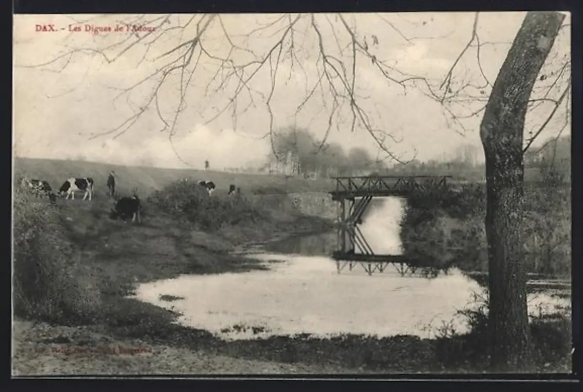 AK Dax, Les Digues de l`Adour avec vaches et pont en arrière-plan