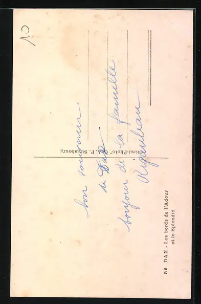 Personenbezogene Daten auf der Rückseite der Karte wurden durch blauen Textmarker unkenntlich gemacht. Die blauen Stellen sind auf die Vorderseite durchgeweicht und wirken sich negativ auf das Postkartenfoto aus