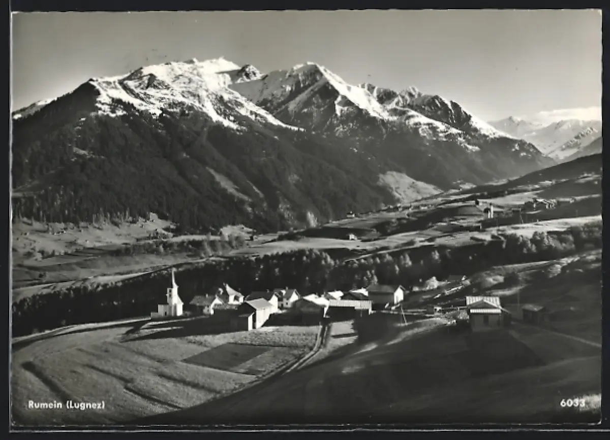 AK Degen /GR, Rumein, Ortsansicht mit Bergpanorama