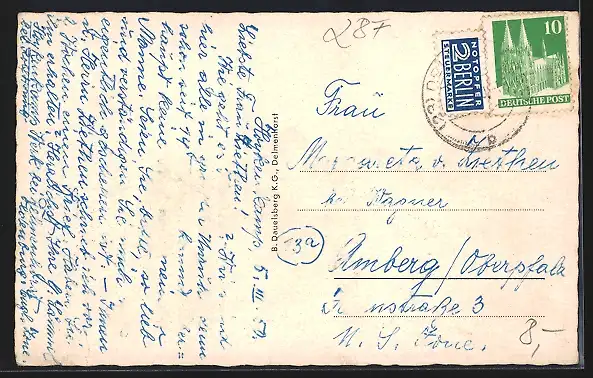 alte Ansichtskarte, gelaufen 1950, rückseitig Oberflächenschaden, guter Zustand