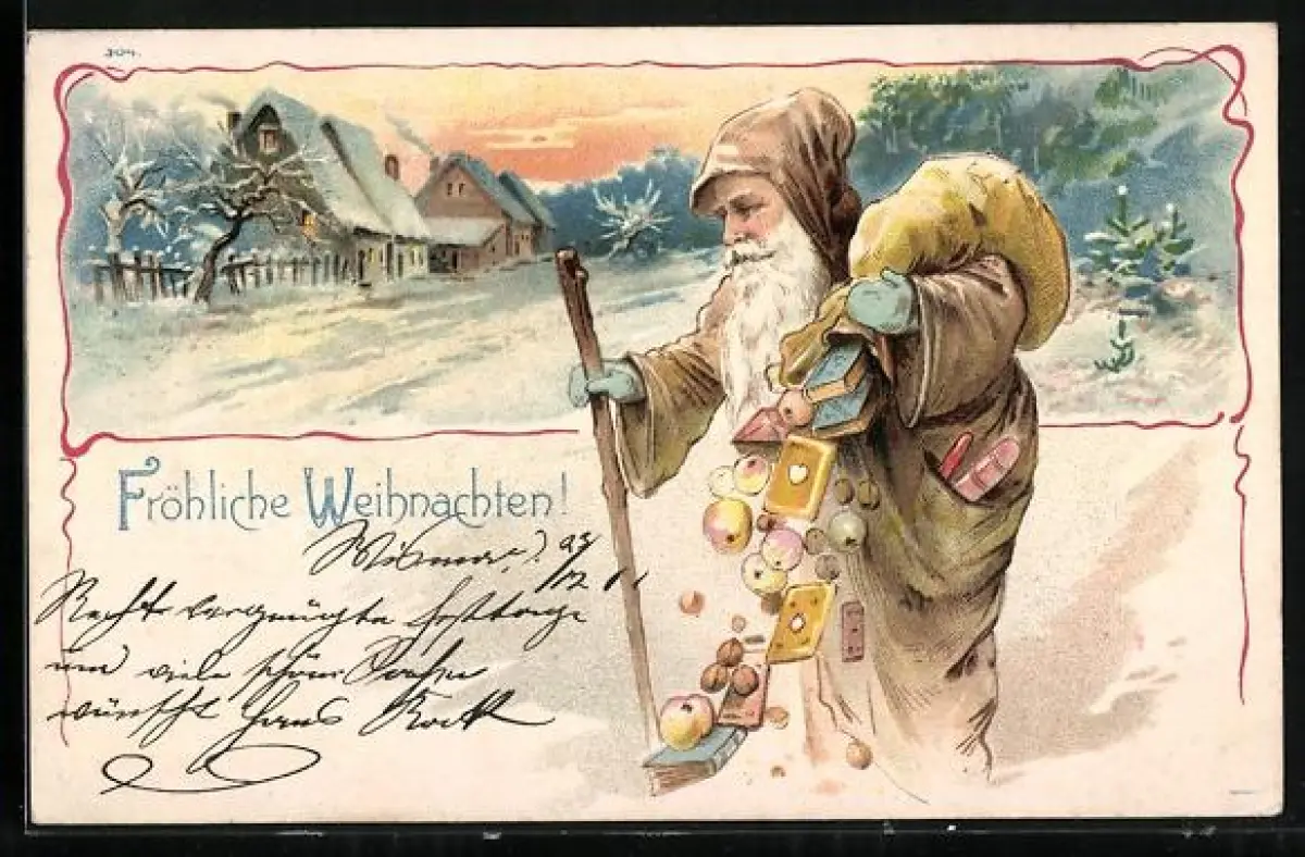 AK Dem Weihnachtsmann fallen Lebkuchen, Nüsse und Bücher aus dem Geschenkesack