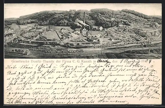 AK Demitz-Thumitz, Granitwerke Demitz-Thumitz der Firma C. G. Kunath mit Eisenbahn, Steinbruch