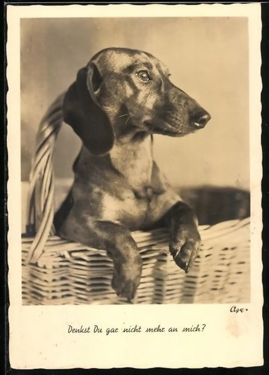 AK Denkst Du gar nicht mehr an mich?, Dackel im Korb