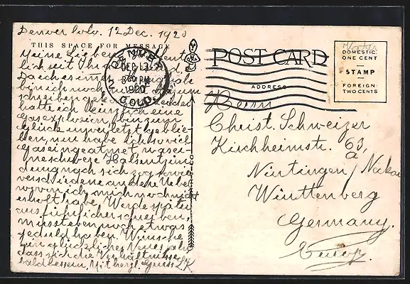 Personenbezogene Daten auf der Rückseite der Karte wurden durch blauen Textmarker unkenntlich gemacht. Die blauen Stellen sind auf die Vorderseite durchgeweicht und wirken sich negativ auf das Postkartenfoto aus