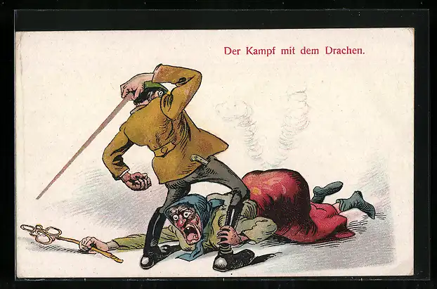 AK Der Kampf mit dem Drachen, Mann schälgt seine Frau