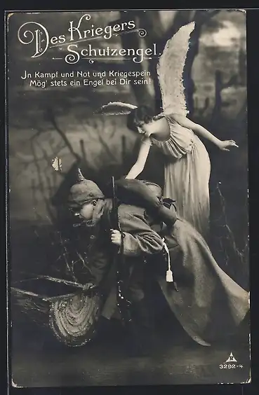 AK Des Kriegers Schutzengel, Engel streckt den Arm nach einem Soldaten in Uniform aus