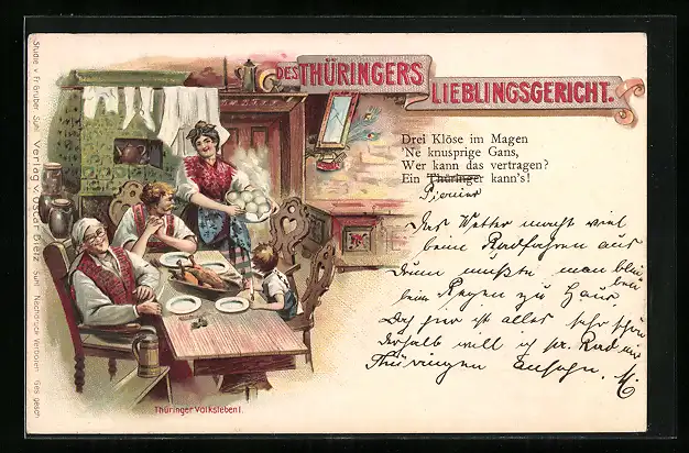 AK Des Thüringers Lieblingsgericht, Türinger Volksleben!, Frau in thüringische Tracht bringt Klösse