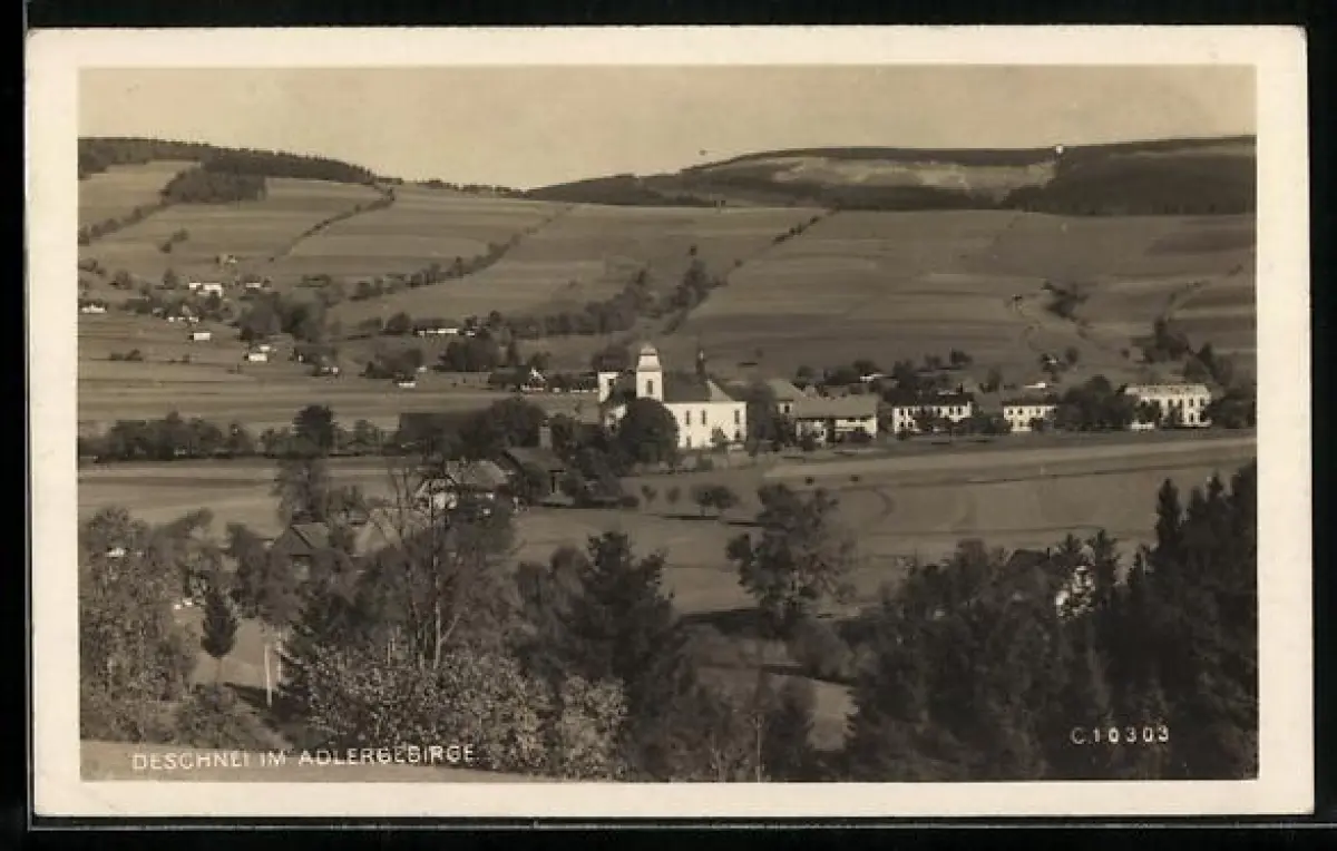 AK Deschnei im Adlergebirge, Ortspartie mit Kirche
