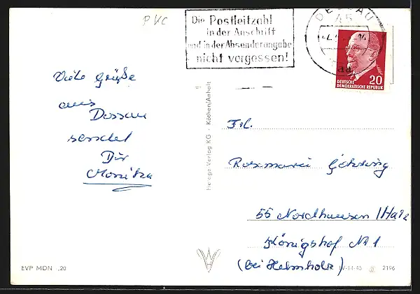 Personenbezogene Daten auf der Rückseite der Karte wurden durch blauen Textmarker unkenntlich gemacht. Die blauen Stellen sind auf die Vorderseite durchgeweicht und wirken sich negativ auf das Postkartenfoto aus