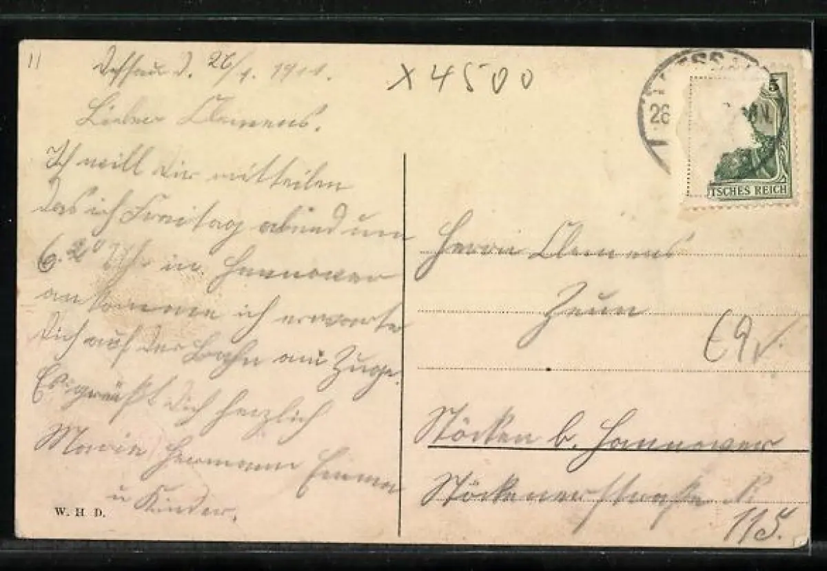 alte Ansichtskarte, gelaufen 1911, Briefmarke entfernt, großer Eckknick rechts unten, sonst guter Zustand