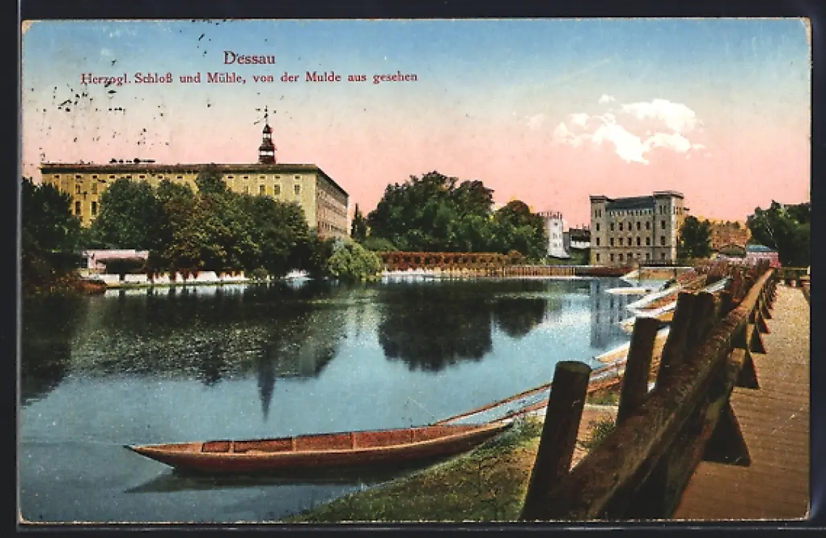AK Dessau, Herzogl. Schloss und Mühle, von der Mulde aus gesehen