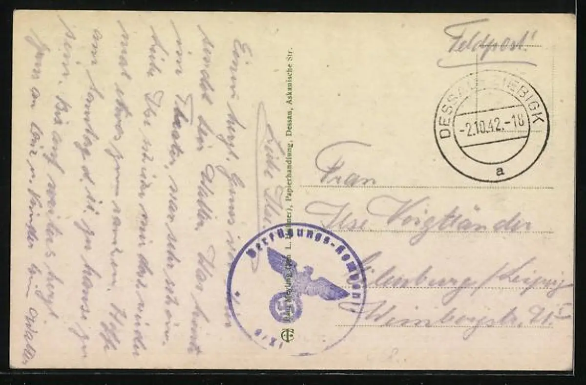 alte Ansichtskarte, gelaufen 1942 als Feldpost, Stempelspur, Eckknick rechts oben, guter Zustand