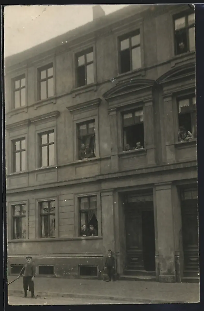 AK Dessau, Wohnhaus mit Bewohnern an den Fenstern