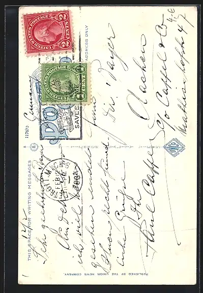 Personenbezogene Daten auf der Rückseite der Karte wurden durch blauen Textmarker unkenntlich gemacht. Die blauen Stellen sind auf die Vorderseite durchgeweicht und wirken sich negativ auf das Postkartenfoto aus