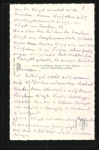 Personenbezogene Daten auf der Rückseite der Karte wurden durch blauen Textmarker unkenntlich gemacht. Die blauen Stellen sind auf die Vorderseite durchgeweicht und wirken sich negativ auf das Postkartenfoto aus