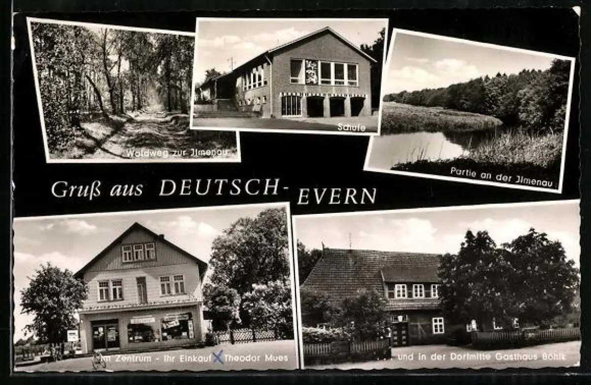 AK Deutsch-Evern /Lüneburg, Waldweg zur Ilmenau, Schule, Gasthaus Böhlk, Geschäft Theodor Mues