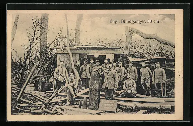 AK Deutsche Soldaten in Uniform mit einem englischen Blindgänger, 38cm-Munition