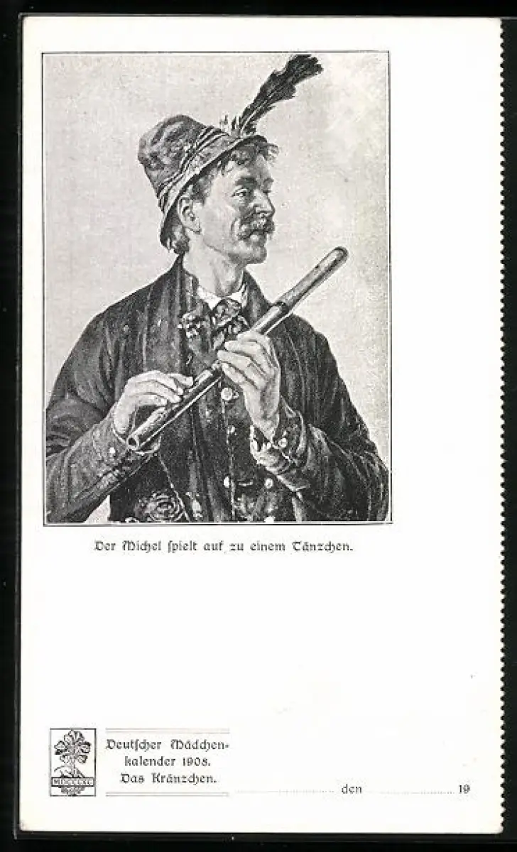 AK Deutscher Mädchenkalender 1908, Das Kränzchen, Der Michel spielt auf zu einem Tänzchen