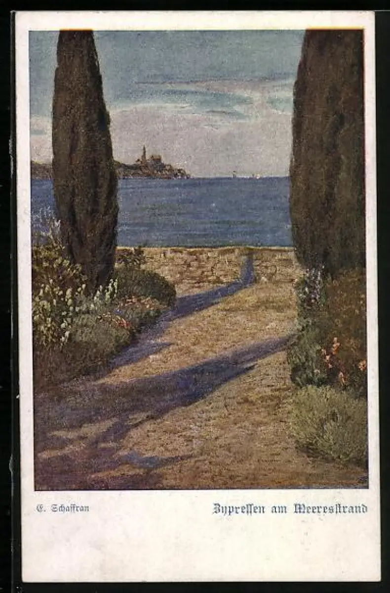 AK Deutscher Schulverein NR. 1094: Zypressen am Meeresstrand